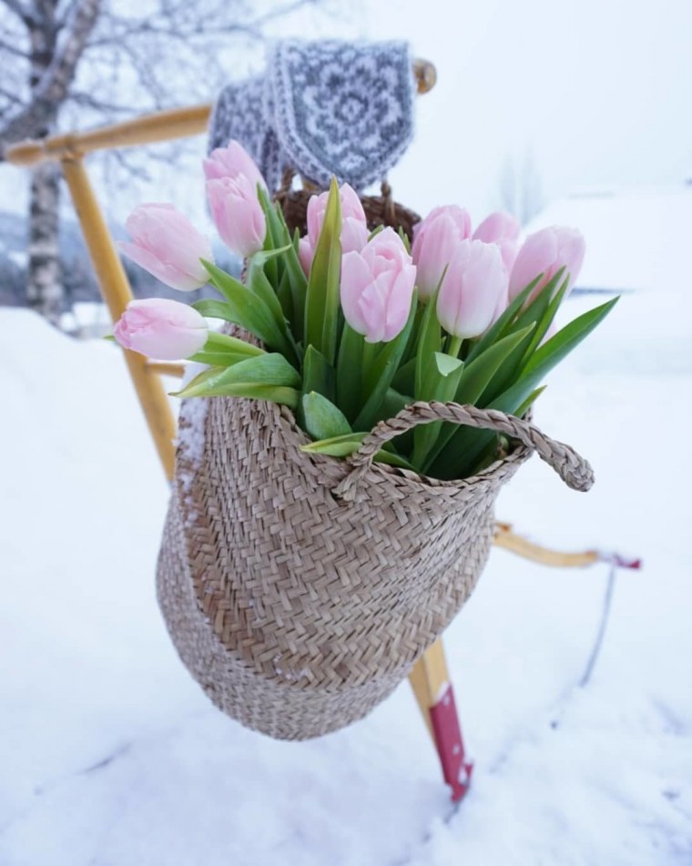 ![Тюльпаны в корзине на снегу]()