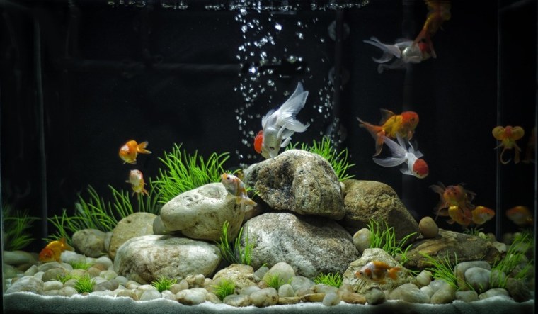 ![Красивый аквариум с золотыми рыбками]()