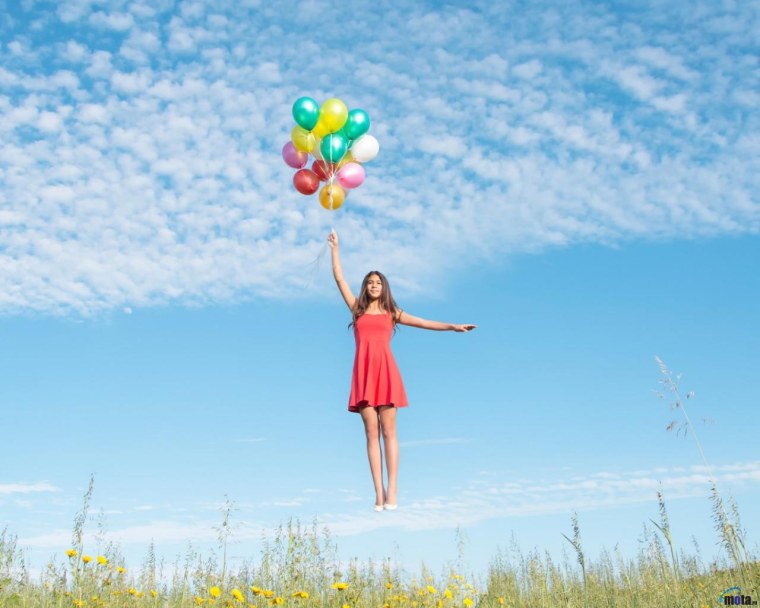 ![Девушка летит на воздушных шарах]()