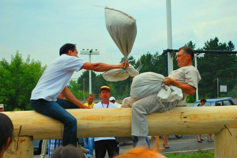 ![Бой мешками на бревне]()
